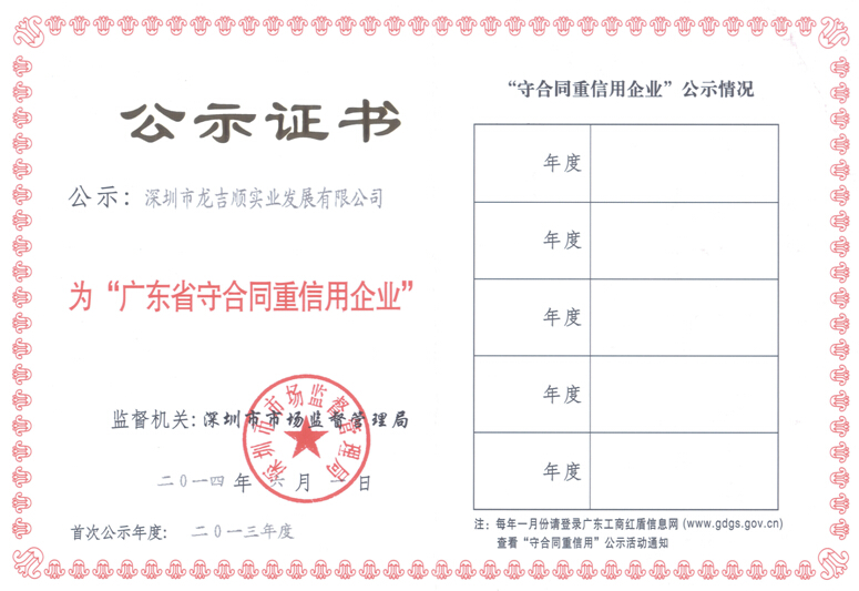 公司參加了廣東省工商行政管理局組織開展的“廣東省守合同重信用企業(yè)”企業(yè)公示活動(dòng),榮獲“2013年度廣東省守合同重信用企業(yè)”榮譽(yù)稱號(hào)。