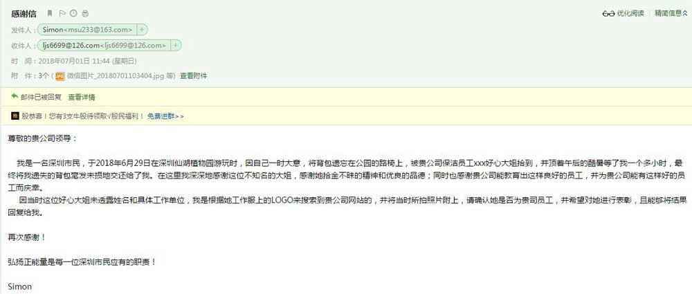 2018年06月29日,市民Simon在仙湖植物園游玩時(shí),因自己一時(shí)大意,將背包遺忘在公園的路椅上,被公司員工曾小青拾到,因現(xiàn)場(chǎng)無(wú)法及時(shí)聯(lián)系到失主,曾小青頂著午后的酷暑等了失主Simon一個(gè)多小時(shí),最終將遺失的背包毫發(fā)未損的歸還給了失主Simon。