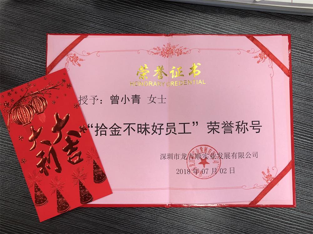 曾小青做好事不留名,市民Simon通過曾小青衣服上的LOGO在網(wǎng)絡(luò)上搜索到公司相關(guān)信息后,通過郵件告知公司此事,公司高度重視并第一時(shí)間向項(xiàng)目部核實(shí)情況,對(duì)于曾小青的拾金不昧精神,公司給予鼓勵(lì)和表彰。