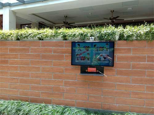 進(jìn)入植物園天上人間公廁的小院中,男女公廁分別有一臺(tái)多媒體宣傳屏,實(shí)時(shí)播放公益廣告,廁所外設(shè)了多個(gè)智能高清攝像頭,實(shí)時(shí)上傳監(jiān)控錄像,對公廁外部環(huán)境的公共安全提供了有效保證。