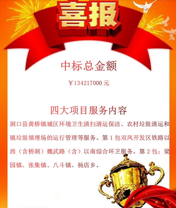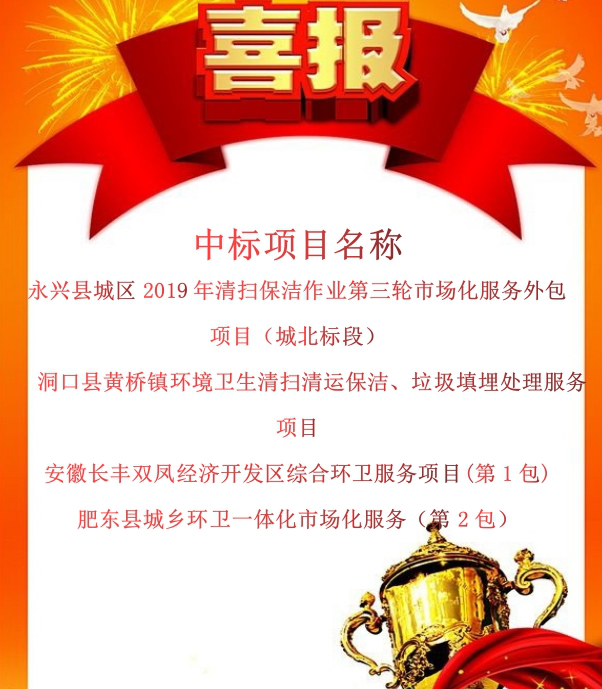八月份,龍吉順公司迎來“大四喜”。成功中標永興縣城區(qū)2019年清掃保潔作業(yè)第三輪市場化服務外包項目(城北標段)、洞口縣黃橋鎮(zhèn)環(huán)境衛(wèi)生清掃清運保潔、垃圾填埋處理服務項目、安徽長豐雙鳳經(jīng)濟開發(fā)區(qū)綜合環(huán)衛(wèi)服務項目(第1包)、肥東縣城鄉(xiāng)環(huán)衛(wèi)一體化市場化服務(第2包)項目,公司又一次實現(xiàn)了質(zhì)的飛躍。